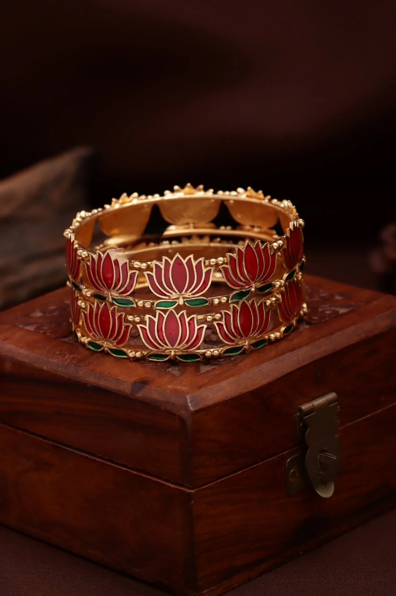 Graceful and timeless, our Enamel Lotus Bangle is a perfect blend of tradition and modern artistry. Designed with delicate lotus motifs and finished with vibrant enamel detailing, this bangle symbolizes purity, beauty, and new beginnings.